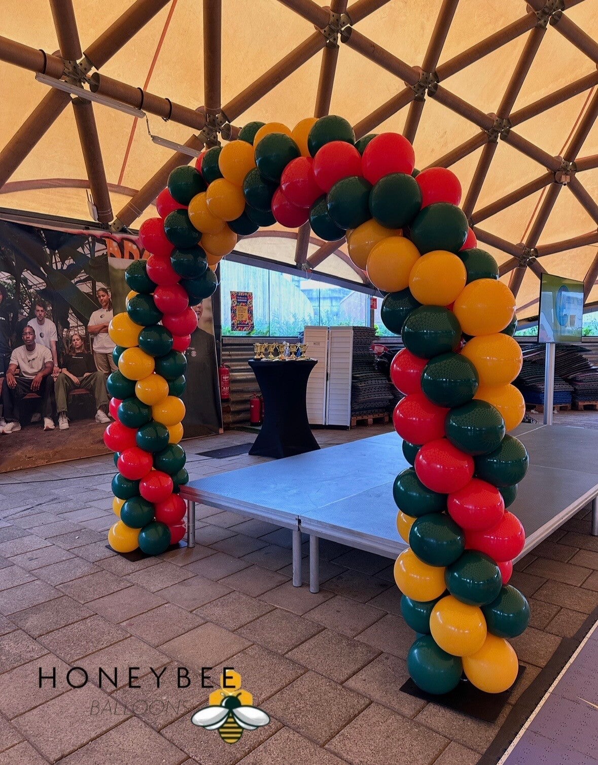 2 backdrop + 3 kleuren ballonnen (halve boog over 2 backdrops) + tekst. (vanaf €224,95)