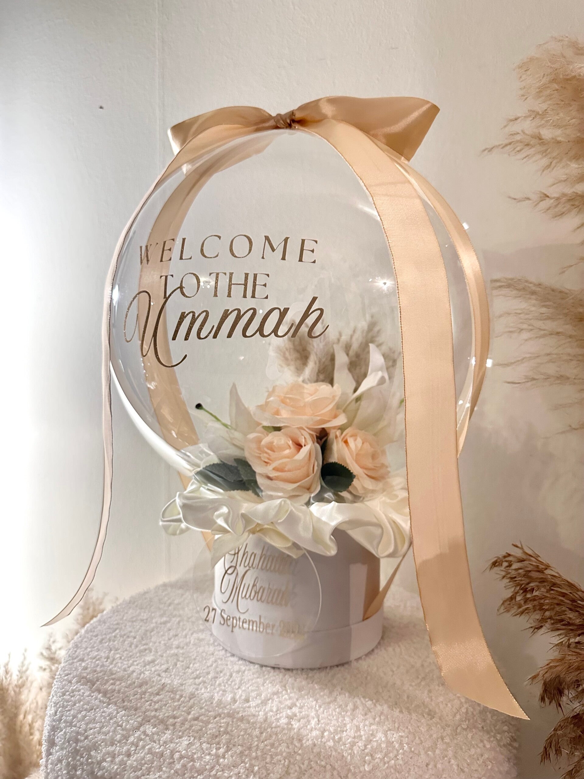 Medium Flowerballoon in perzik tinten met crème satijnendoek en gepersonaliseerde tag.