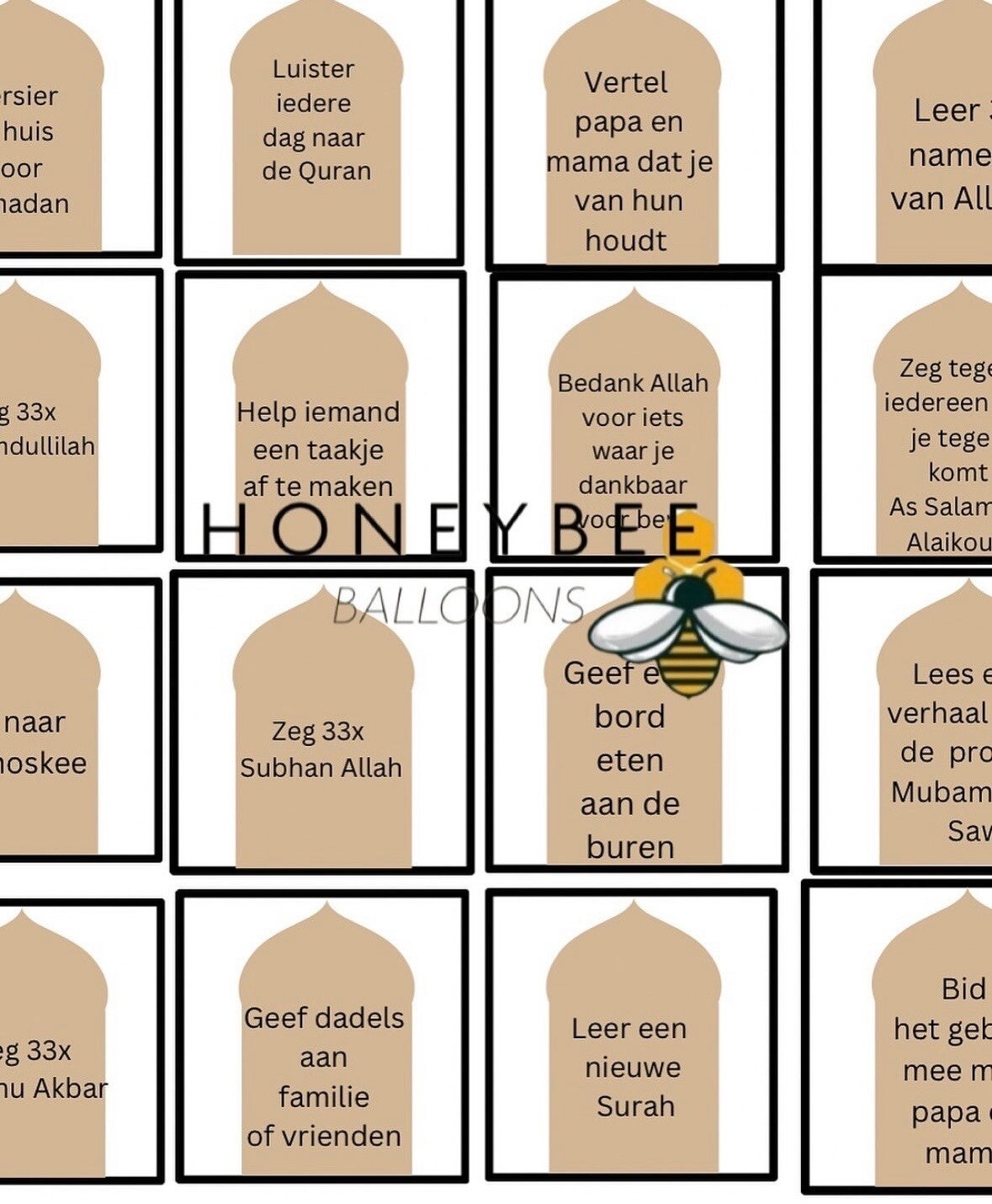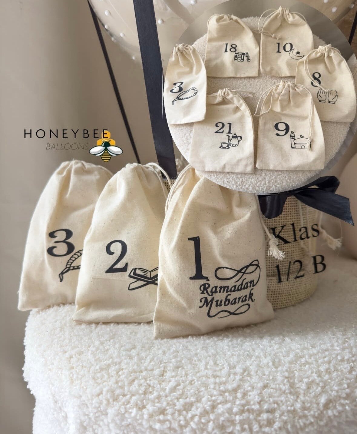 Kalender heeft 30 bedrukte Ramadan zakjes met opdrachtjes. Daarnaast kan er zelf nog wat toegevoegd worden in het zakje.